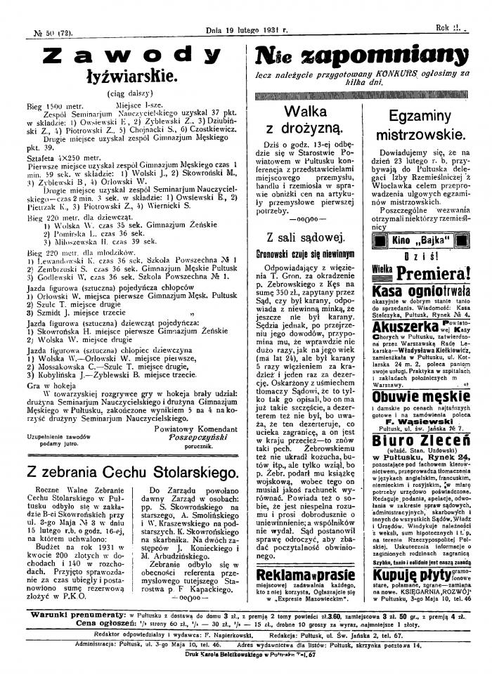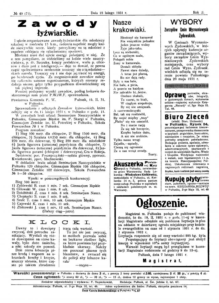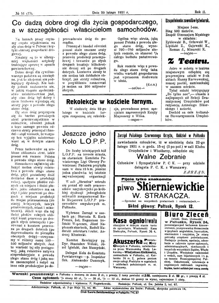 Gazetę można było prenumerować z dostawą do domu za 3 zł., z premją (premią) 2 tomy powieści za 3.60 zł, zamiejscowa - 3 zł. 50 gr. z premją 4 zł. Cena ogłoszeń: 1/2 strony 60 zł., 1/4 — 30 zł., 1/8 — 15 zł., drobne 10 groszy za wyraz, najmniejsze 1 złoty. Archiwalne egzemplarze (z lat 1931–1936) są dostępne w postaci zdigitalizowanej w bibliotekach cyfrowych, np. CRISPA, z której to strony korzystamy, aby przybliżyć Wam życie przedwojennego Pułtuska. Czytając artykuły, warto zwrócić uwagę nie tylko na tematykę, ale także na styl pisania i kompletny brak dzisiejszego RODO. Zapraszamy do podróży w czasie, do miejsca dobrze nam znanego, ale tak różnego. Tym samym rozpoczynamy nowy cykl: „Czym żył Pułtusk 95 lat temu”. Dziś przedstawiamy najważniejsze wydarzenia z miasta i okoli z 18, 19 i 20 lutego 1931 roku, zachowując oryginalną pisownię.