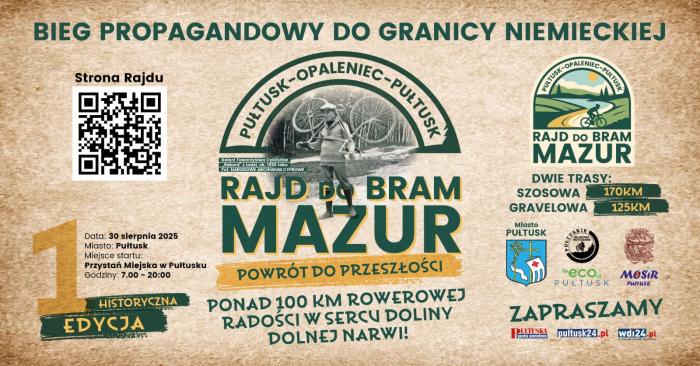Hej, rowerowi entuzjaści szutrowych i szosowych wyzwań! 30 sierpnia 2025 r. czeka Was wielkie kolarskie święto! Startuje I edycja „Rajdu do bram Mazur”. Zapiszcie się na tę wyprawę już dziś. Czekają na Was dwie trasy - Szutrowa Przygoda w Dolinie Narwi i Szosowy Ślad Historii: „Bieg propagandowy do granicy niemieckiej”.