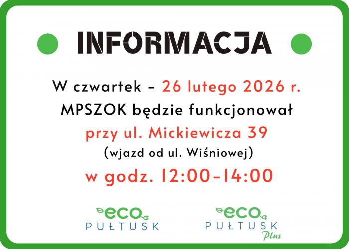Mieszkańcy Pułtuska mogą skorzystać z usług Mobilnego Punktu Selektywnej Zbiórki Odpadów Komunalnych w czwartek 26 lutego. Zgodnie z informacją udostępnioną przez Eco PUŁTUSK oraz EcoPUŁTUSK Plus, punkt będzie działał w następujący sposób: