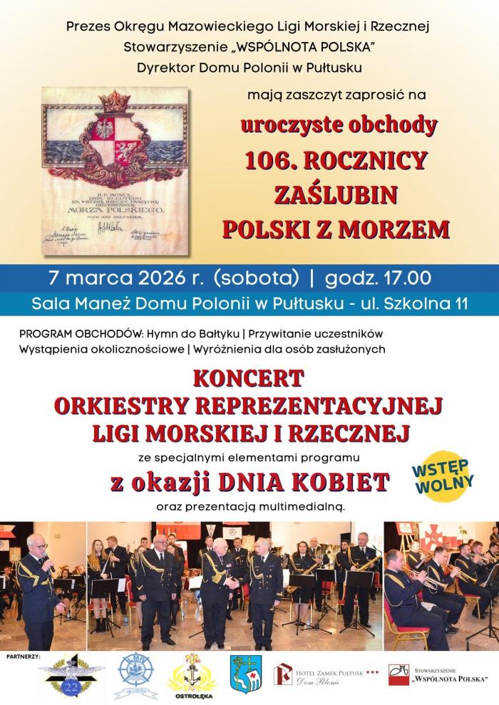 „Oto dziś dzień krwi i chwały. Jest on dniem wolności, bo rozpostarł skrzydła Orzeł Biały nie tylko nad ziemiami polskimi, ale i nad morzem polskim” - słowa te wypowiedział generał dywizji Józef Haller, podczas ceremonii zaślubin Polski z morzem 10 lutego 1920 roku w Pucku – wydarzeniu symbolizującym powrót kraju nad morze po zaborach i przejęcie Pomorza przez Wojsko Polskie na mocy traktatu wersalskiego. Zaślubiny odbyły się poprzez wrzucenie do morza platynowego pierścienia ufundowanego przez gdańszczan. O tym znaczącym fakcie co roku przypomina m.in. Liga Morska i Rzeczna, organizując uroczystości w całej Polsce. Również w Pułtusku od kilku lat Okręg Mazowiecki LMiR zaprasza na rocznicowe obchody. W tym roku uroczystości odbędą się już w najbliższą sobotę 7 marca w Domu Polonii w Pułtusku.