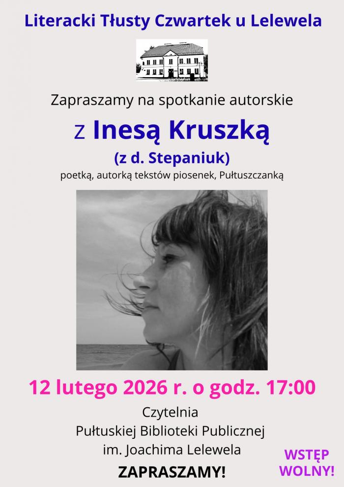 Pułtuska Biblioteka Publiczna im. Joachima Lelewela serdecznie zaprasza mieszkańców na wyjątkowe wydarzenie z cyklu „Literacki Tłusty Czwartek”. Gościem specjalnym spotkania będzie Inesa Kruszka (z d. Stepaniuk) – utalentowana poetka, autorka tekstów piosenek oraz rodowita pułtuszczanka.