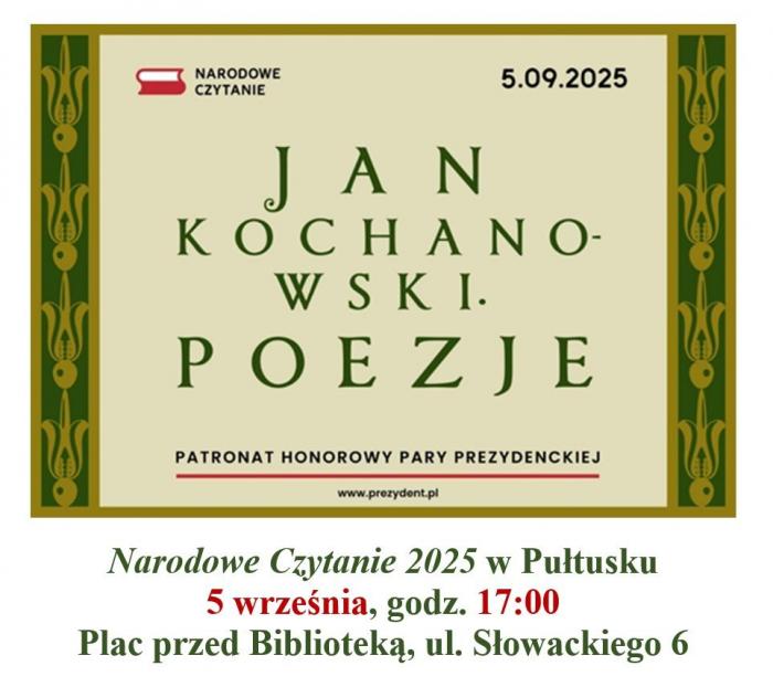 Już po raz kolejny Pułtuska Biblioteka Publiczna im. J. Lelewela w Pułtusku zaprasza na Narodowe Czytanie – poezji Jana Kochanowskiego. Tegoroczna edycja odbędzie się 5 września (piętek) o godzinie 17:00 na placu przed biblioteką przy ul. Słowackiego 6.