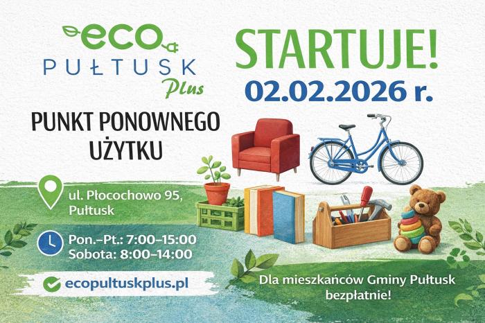 2 lutego gmina Pułtusk zrobi kolejny ważny krok w stronę ekologii. Swoją działalność rozpocznie Punkt Ponownego Użytku (PPU) – miejsce, w którym niepotrzebne nam, ale wciąż sprawne przedmioty, znajdą nowych właścicieli. Co najważniejsze: wszystko odbędzie się całkowicie bezpłatnie.