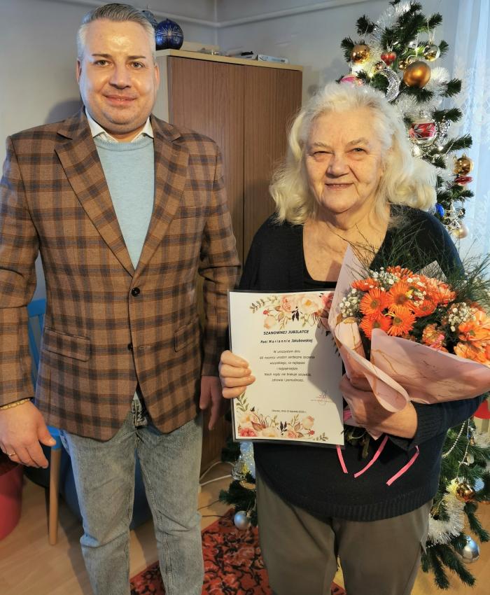 Tym razem z okazji 80. urodzin Wójt odwiedził panią Mariannę Jakubowską. Przekazał Jubilatce, poza życzeniami, kwiaty i słodki upominek.