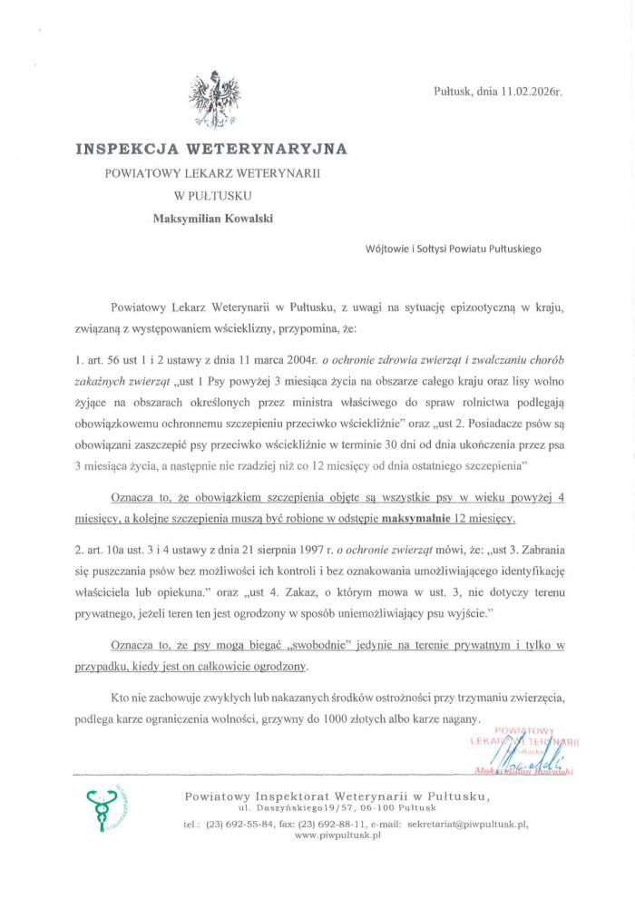 11 lutego 2026 roku Powiatowy Lekarz Weterynarii w Pułtusku skierował do wójtów i sołtysów Powiatu Pułtuskiego pismo. Przypomina w nim, że z uwagi na sytuację epizootyczną w kraju, związaną z występowaniem wścieklizny, konieczne jest przestrzeganie poniższych zasad.