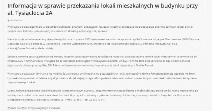 „Gmina Pułtusk wywiązała się ze wszystkich zobowiązań wynikających z zawartej umowy. Pomimo tego oraz uzyskania decyzji o pozwoleniu na użytkowanie obiektu przez spółkę, SIM Północne Mazowsze odmawia obecnie przekazania lokali mieszkalnych Gminie Pułtusk” - czytamy w informacji Urzędu Miejskiego w Pułtusku.