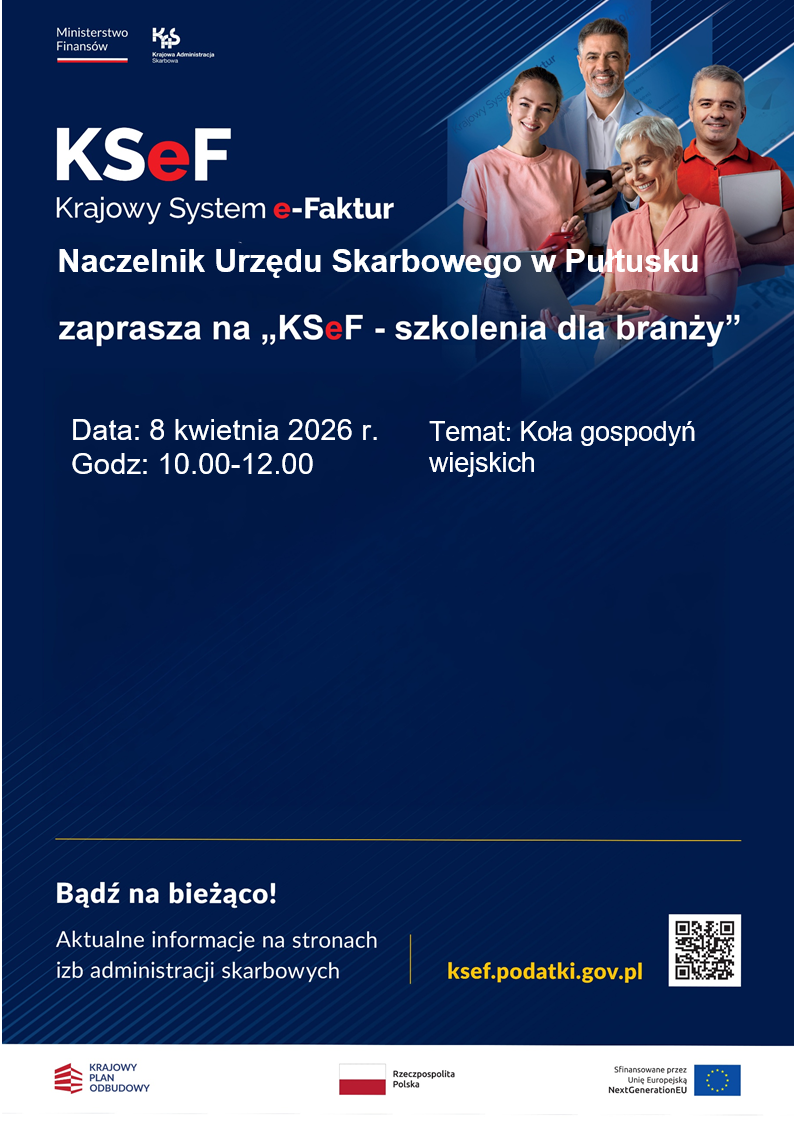 Naczelnik Urzędu Skarbowego w Pułtusku organizuje specjalistyczne spotkanie informacyjne dotyczące Krajowego Systemu e-Faktur. Najbliższa edycja szkolenia z cyklu „KSeF – szkolenia dla branży” zostanie poświęcona Kołom Gospodyń Wiejskich.