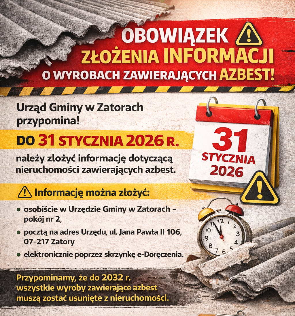 Urząd Gminy w Zatorach przypomina o obowiązku złożenia do 31 stycznia 2026 r. informacji dotyczącej wyrobów zawierających azbest. Obowiązek ten dotyczy wszystkich właścicieli, zarządców oraz użytkowników wieczystych nieruchomości, na których znajdują się materiały zawierające azbest.