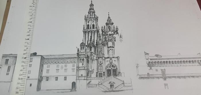 ML: To kwestia spojrzenia. Widzę coś i myślę – O! To dałoby się narysować! Teraz na przykład wkręciłem się w rysowanie katedry w Santiago de Compostela. Widział mój rysunek pewien architekt. Powiedział - „Jeżeli Pan rysuje to bez przygotowania, to ja, jako architekt muszę Panu powiedzieć, że udało się to Panu!” Tu dojdzie jeszcze jedna wieża, ale zamysł mam taki – jak skończę katedrę, narysuję Katedrę w Oviedo, a jako dopełnienie tego tryptyku kościółek/ kaplicę z XV czy XVI wieku, który jest na „trasie szpitali” Ruta de los Hospitales, jak idzie się Camino Primitivo, z kamienia, wielkości połowy mojej księgarni. Obok stoją trzy domy na grzbiecie wzgórza. Tam nic nie ma... jest tylko ta kaplica, trzy domy i... nic. Jaka jest przepaść w uwielbieniu boga w wielkich miastach, a na tej biednej prowincji, gdzie tych kościółków właśnie tak zachowanych jest jeszcze sporo do obejrzenia. Także wracając do tematu inspiracji... musi być ten błysk, to coś!