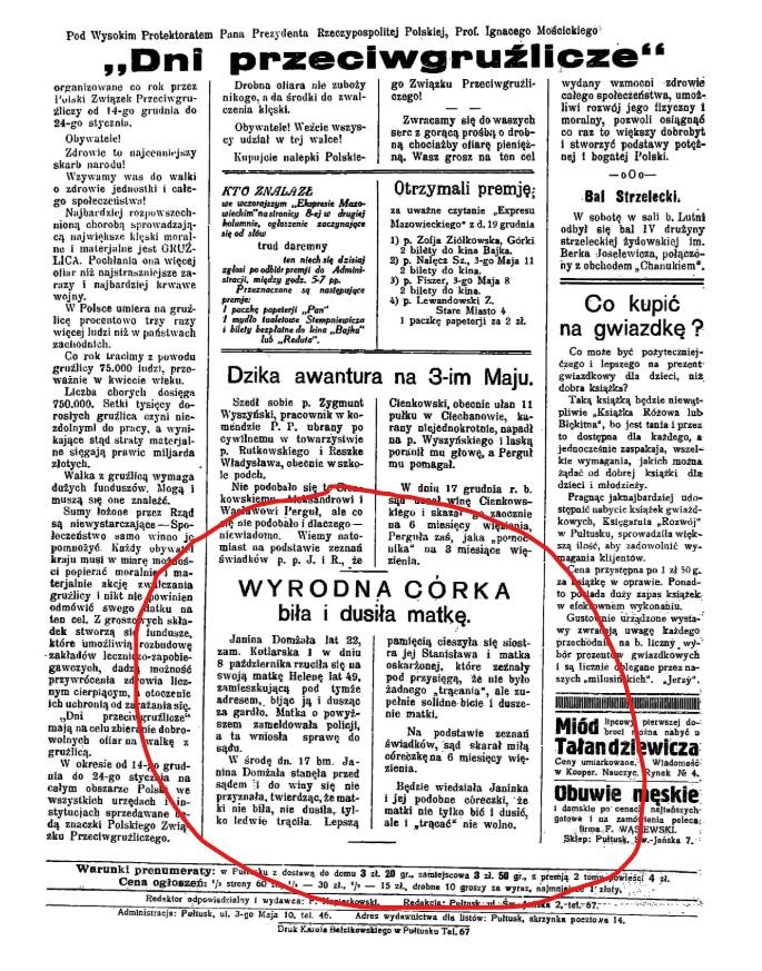 Tekst ten pochodzi z 14 numeru Ekspresu Mazowieckiego z 1930 roku, w którym zawsze ostatnia strona poświęcona była wydarzeniom głównie z Pułtuska, czasem z okolic. Historia ta więc jest niewątpliwie historią prawdziwą. Ale to, co rzuca się w oczy, to zdecydowana różnica między dzisiejszym dziennikarstwem, a tym przedwojennym.
