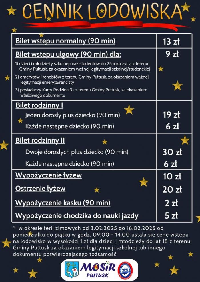 Lodowisko czynne będzie od poniedziałku do piątku w godzinach 15:00-20:30, a w weekendy od 9:00 do 20:30. Dziś, w dniu otwarcia, wstęp jest bezpłatny, a w pozostałe dni obowiązuje załączony niżej cennik.