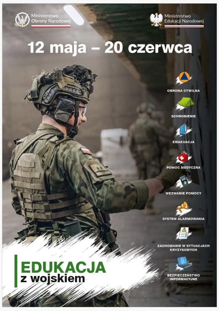 Program „Edukacja z wojskiem” polega na przeprowadzeniu przez żołnierzy Wojska Polskiego specjalnie opracowanych zajęć w szkołach podstawowych i ponadpodstawowych. Ich głównym celem jest podniesienie świadomości w obszarze bezpieczeństwa i obronności oraz kształtowanie podstawowych nawyków i umiejętności z zakresu obrony oraz ochrony ludności, a także zachowania w sytuacjach kryzysowych.