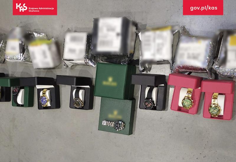 Galeria przedstawia zdjęcia z zatrzymanych podczas kontroli w sortowni firmy kurierskiej podrobionych zegarków światowych marek oraz niewiadomego pochodzenia leków na potencję. Funkcjonariusze Służby Celno-Skarbowej z Mazowieckiego Urzędu Celno-Skarbowego zabezpieczyli ponad tysiąc podrobionych zegarków i tysiące tabletek, szacując wartość towaru na ponad 52 mln zł. Śledztwo wciąż trwa, a osobom odpowiedzialnym za nielegalny obrót grozi kara pozbawienia wolności.