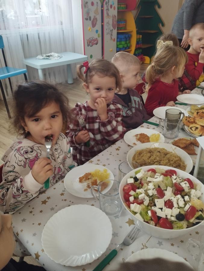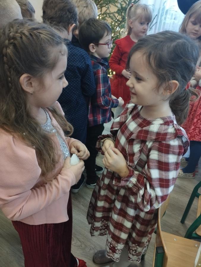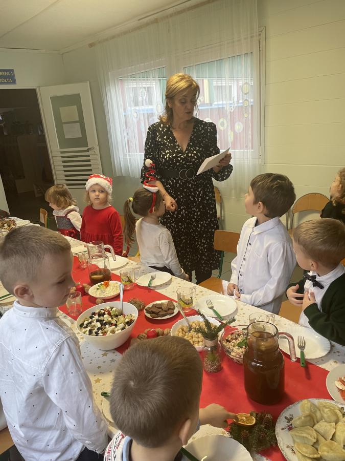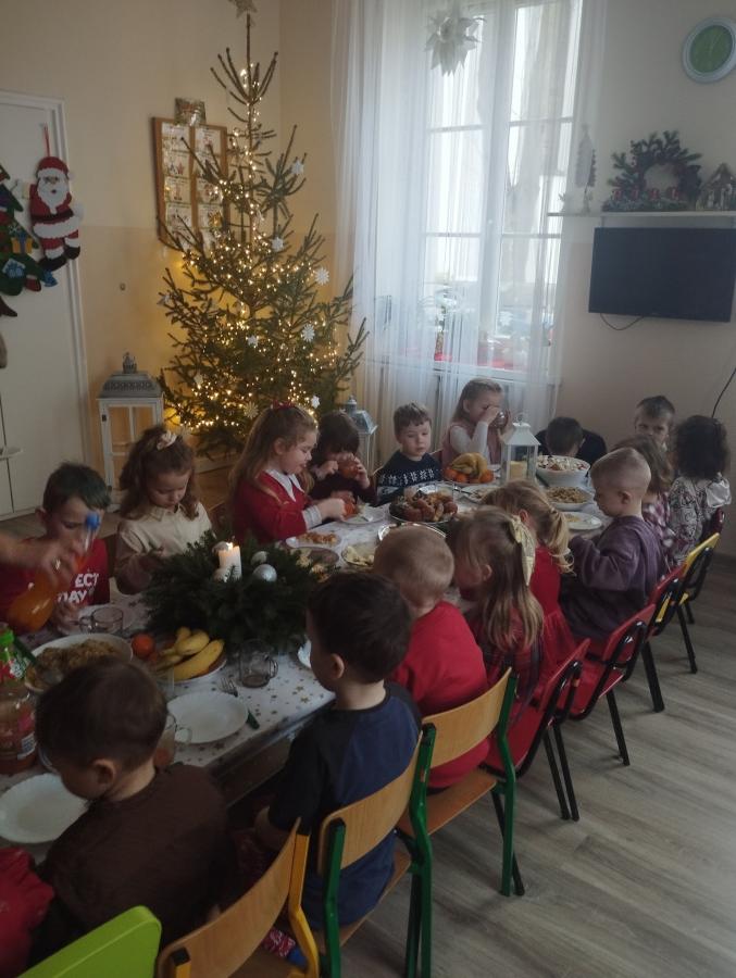Galeria Świąteczne spotkanie w przedszkolu - dzieci dzielące się opłatkiem, składające życzenia i biorące udział w świątecznym obiedzie. Pięknie przystrojony stół, wspólne śpiewanie kolęd - wszystko w serdecznej atmosferze zapowiadającej zbliżające się Święta Bożego Narodzenia.